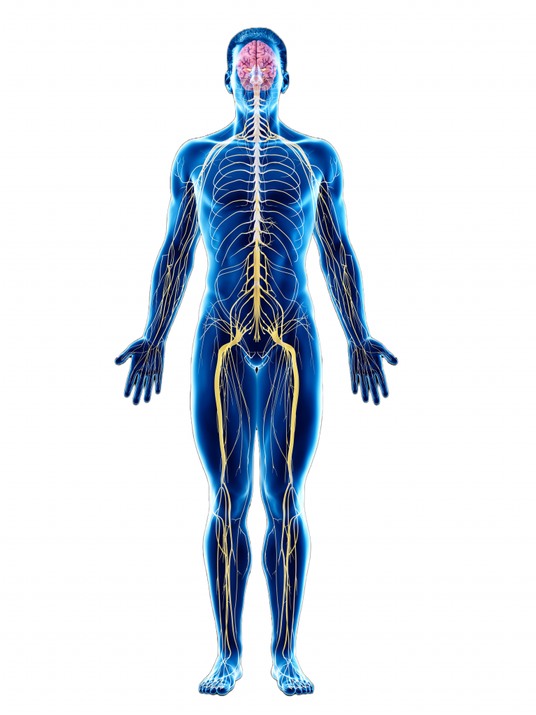 Nous avons dans le corps, des nerfs qui naissent au niveau du tronc cérébral, les nerfs crâniens ; les nerfs spinaux naissent au niveau de la moelle épinière et progressent dans l’ensemble du corps jusqu’aux terminaisons nerveuses que l’on retrouve à chaque extrémité du corps (pieds, mains, visage, oreilles…).