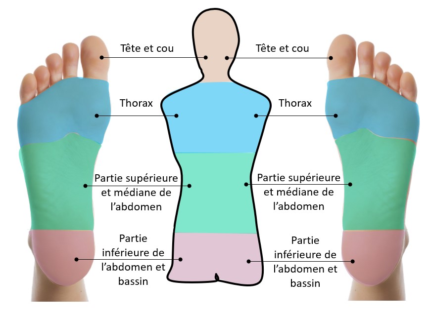 Chaque partie du corps, de la tête aux pieds, sur le devant et à l’arrière, possède une zone réflexe correspondante sur les pieds, lesquelles dessinent ainsi une carte de notre corps.